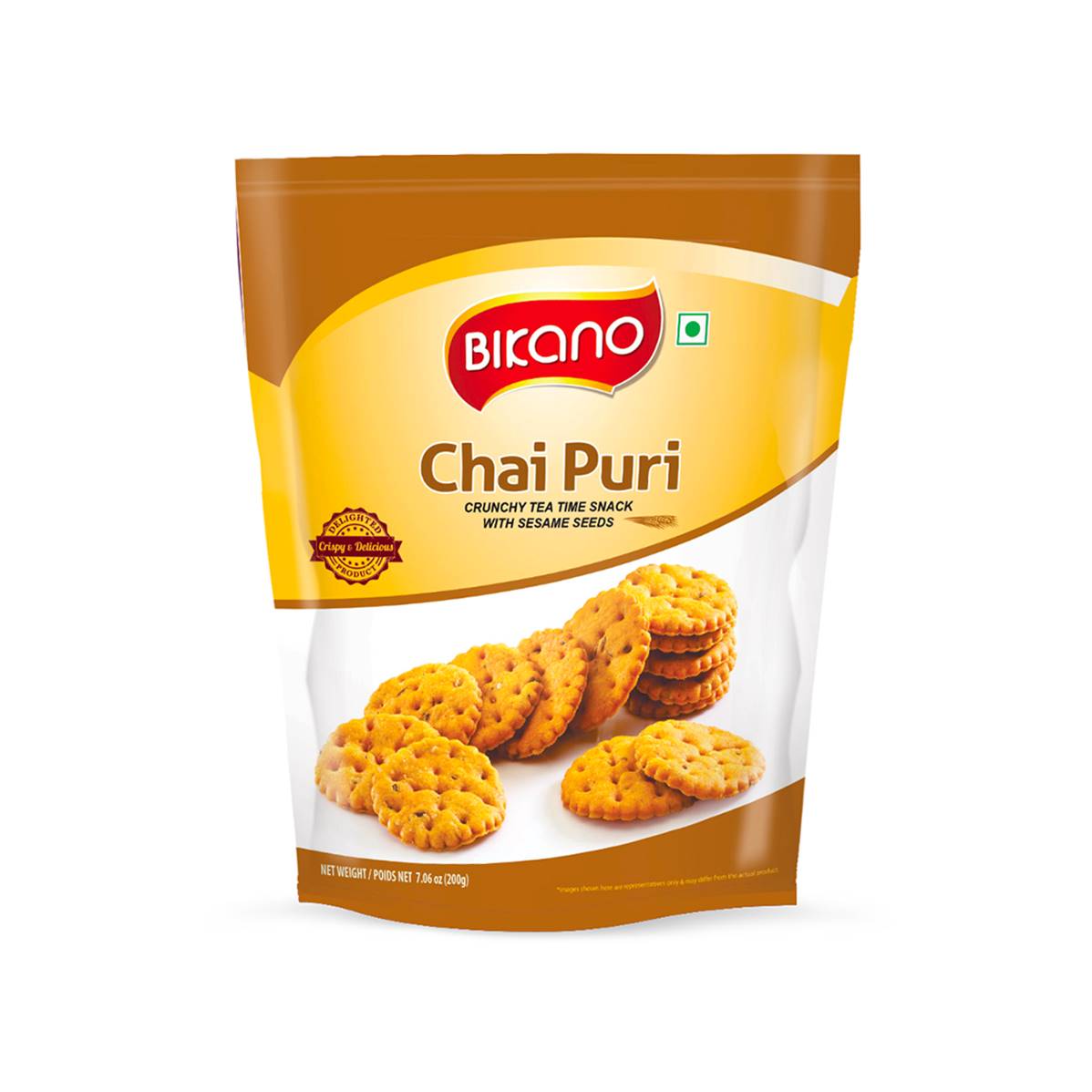 Le chai puri est une collation croustillante et épicée à base de farine de blé frite. Le mélange d'épices peut inclure du cumin, du sel, du chili en poudre et d'autres épices indiennes pour donner au chai puri une saveur distinctive et épicée. Le Bikano Chai Puri est généralement consommé avec du thé (chai) en Inde et est idéal pour grignoter entre les repas ou pour accompagner un repas. Il est souvent présenté en magasin sous la forme d'un emballage prêt à manger, ce qui en facilite la distribution et la consommation.