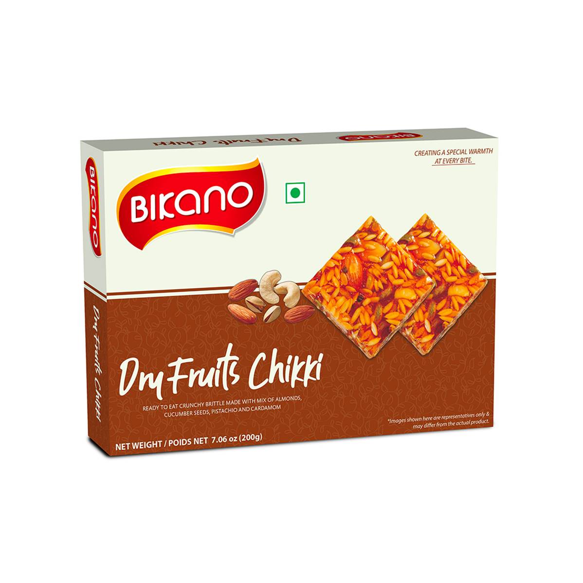 Le Chikki Mix Dry Fruit est une confiserie indienne préparée à base d'un mélange de fruits secs et de caramel. C'est un en-cas énergétique et délicieux, apprécié partout en Inde. Pour préparer le Chikki Mix Dry Fruit, on cuit du sucre ou du jaggery (sucre non raffiné) jusqu'à ce qu'il devienne un caramel. On y ajoute ensuite un mélange de fruits secs, tels que des noix de cajou, des amandes, des pistaches et des raisins secs. Le mélange est étalé en une fine couche et refroidi avant d'être découpé en morceaux pour être servi.