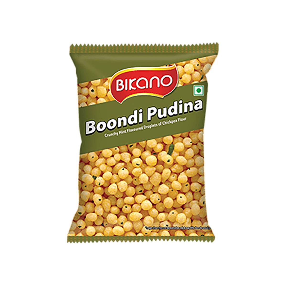 Le Bikano Podina Boondi est une collation indienne populaire fabriquée par la société Bikanervala, qui est une entreprise alimentaire basée en Inde. Cette collation est faite à partir de farine de pois chiche, de menthe et de diverses épices