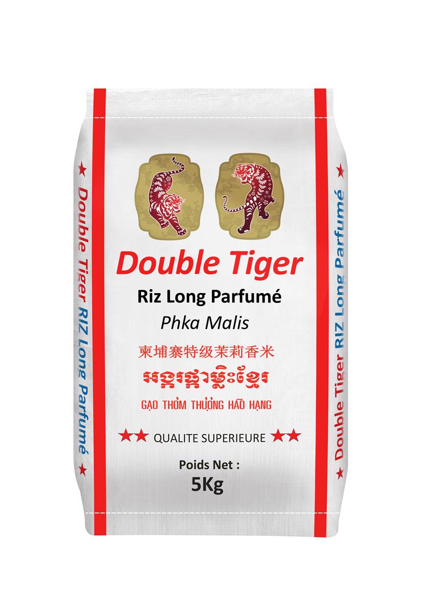 Le riz Double Tiger long parfumé du Cambodge, également connu sous le nom de riz parfumé de Phka Malis, est une variété de riz parfumé originaire du Cambodge. Il est cultivé dans les régions fertiles du pays, où le sol et le climat sont particulièrement adaptés à la culture du riz. Le riz long parfumé du Cambodge est caractérisé par un grain long et fin, une texture légèrement collante et un parfum naturellement sucré et floral. Il est largement considéré comme un des meilleurs riz au monde en raison de sa qualité supérieure et de son goût exquis. Ce riz est souvent utilisé pour les plats asiatiques traditionnels tels que les sushis, les nasi goreng (riz frit indonésien) et les plats de riz sauté.