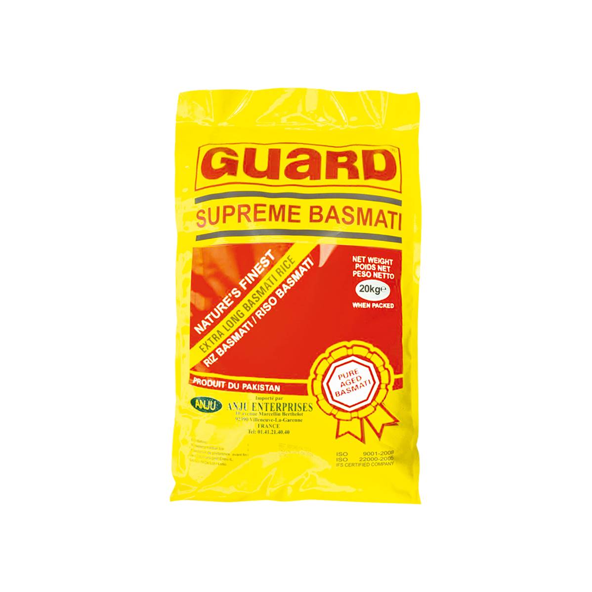 Le Guard Supreme Basmati est un riz long et parfumé. Cultivé après des années de recherche et de développement dans les rizières du Punjab et irrigué par les eaux de fonte de l'Himalaya, le Guard Supreme Basmati est soigneusement vieilli pendant deux ans pour lui conférer l'arôme unique et authentique du pur Basmati. Avec un parfum puissant, le riz Guard Supreme Basmati est d'une qualité exceptionnelle et incomparable.